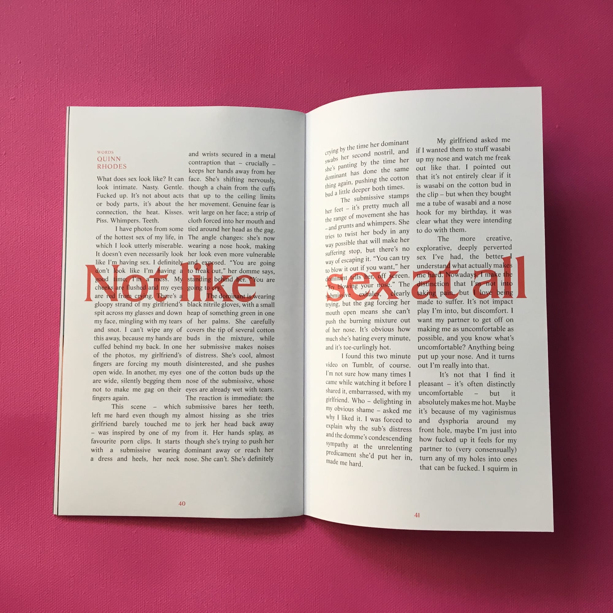 - I’m honoured that my essay ‘Not like sex at all’ was published in the first ever issue of PULP, an erotic zine co-created by Megan Wallace and Jack Rowe. My piece is the filthiest thing I’ve written in quite a while, and it's so cool to see it in print alongside so much other incredible erotic writing and photography.