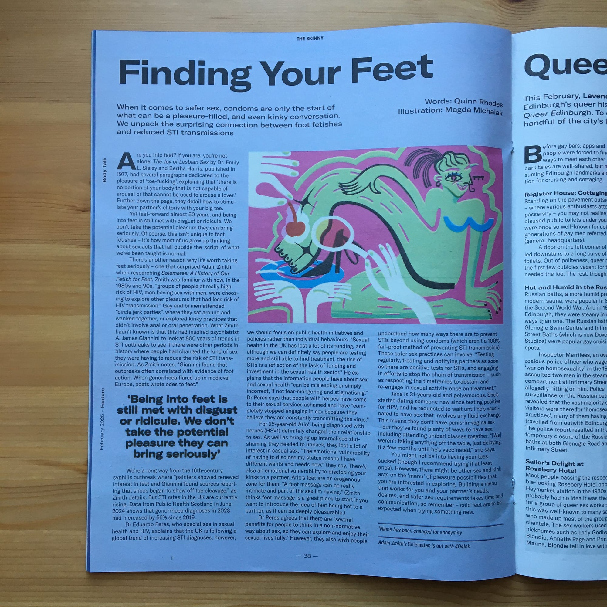 - I got to be a sexual health nerd and write about foot fetishes and STIs for the February issue of The Skinny! Research shows that throughout history, STI outbreaks correlated with increased evidence of people being into feet. When gonorrhoeal flared up in medieval Europe, poets wrote odes to feet; during the AIDS crisis, queer men attended circle jerk parties. But with STI diagnosis rates in the UK currently rising, I explored whether people are turing to foot fetishes and other kinks to reduce their risk of STI transmission today.